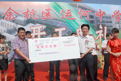 7月3日,烈日炎炎,在運河中學(xué)舉行的開工典禮上,東華集團董事長宣碧華熱心參與余杭區(qū)運河鎮(zhèn)組織的“捐資助?!すΦ虑铩贝壬凭栀浕顒?,向運河中學(xué)建校捐款100萬元,為“運河中學(xué)”建設(shè)項目添磚加瓦,充分體現(xiàn)了東華集團關(guān)心、支持教育事業(yè)的拳拳愛心。