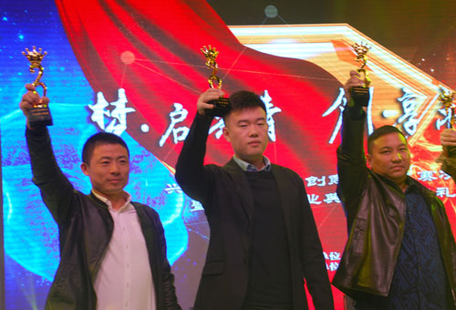 副董事長宣成(中)與其他十佳創(chuàng)業(yè)明星高興獎(jiǎng)杯