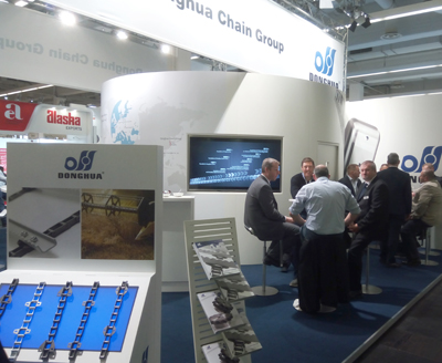 本屆展會(huì)中全球前三大農(nóng)機(jī)主機(jī)企業(yè)John-Deere、CLAAS、CNH展臺(tái)規(guī)模最大,人氣最旺。從展會(huì)上主機(jī)設(shè)備所配套的鏈條來(lái)看,東華鏈條產(chǎn)品已深入農(nóng)機(jī)主機(jī)市場(chǎng),如東華牌驅(qū)動(dòng)鏈、喂入鏈、提升鏈、玉米鏈等,在某些主機(jī)企業(yè)占比達(dá)50%以上,某些知名主機(jī)企業(yè)均用東華鏈條,占比100%。