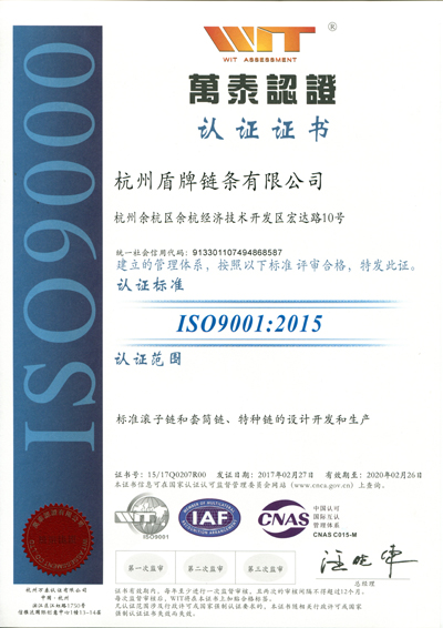 2015版本質(zhì)量、環(huán)境管理體系認證為當前國際標準最新版認證。盾牌公司順利通過認證,代表著公司在標準滾子鏈和套筒鏈、特種鏈的設(shè)計開發(fā)和生產(chǎn)及其所涉及的環(huán)境管理在管理體系上走在了同行的前列,為進一步提升客戶服務(wù)、樹立品牌形象提供了更加有力的支撐。
