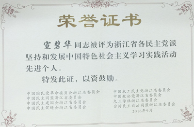 日前,浙江省各民主黨派堅持和發(fā)展中國特色社會主義學習實踐活動宣傳展示會在杭州召開。會議共表彰了22位浙江省各民主黨派堅持和發(fā)展中國特色社會主義學習實踐活動先進個人,我集團董事長宣碧華榮獲“浙江省民主黨派學習實踐活動先進個人”稱號,成為浙江省民建3位先進個人受到表彰。