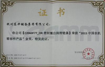 會上,與會人員主要圍繞會議主題進行技術(shù)、市場、創(chuàng)新、發(fā)展等廣泛交流。會議期間,評比并頒發(fā)了2015中國農(nóng)機零部件46項金獎產(chǎn)品和25項創(chuàng)新獎產(chǎn)品。東華申報的C2060F77_OR和C2062H_ORSDF1密封圈鏈條經(jīng)久保田、福田雷沃等知名整機企業(yè)的推薦,專家委員會最終評審決定,對 東華申報的這兩款密封圈鏈條分別授予金獎和創(chuàng)新獎。這個獎項是目前農(nóng)機鏈條企業(yè)的最高榮譽,體現(xiàn)了東華農(nóng)機鏈條處于國內(nèi)同行領(lǐng)先水平,得到廣大農(nóng)業(yè)主機單位的贊譽和認(rèn)可。東華生產(chǎn)的農(nóng)機鏈條也暢銷國際市場,與CLASS、紐荷蘭等世界500強企業(yè)配套。