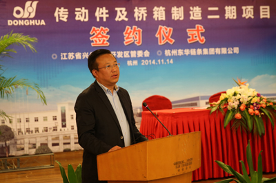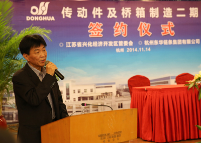 簽約儀式上,董事長宣碧華致辭。他說,東華2007年收購興化齒輪廠,至今已有8年,一直得到了興化市委、市政府和興化開發(fā)區(qū)的大力支持,使一個(gè)當(dāng)時(shí)不太景氣的企業(yè),得到了新生、發(fā)展?,F(xiàn)在不僅是鏈條行業(yè),齒輪、鏈輪、變速箱、橋箱將同步發(fā)展。今天簽約的興化這個(gè)項(xiàng)目,我們考慮了東華發(fā)展的增量和存量。增量是我們希望到2020年生產(chǎn)總量翻一番,興化的這個(gè)土地就是我們的增量空間。存量有兩塊,一是原來我們在外采購的原材料、零部件,拿回來放在興化生產(chǎn),保證質(zhì)量;二是現(xiàn)在臨平三廠區(qū)制造鏈條要退二進(jìn)三,騰籠換鳥,把騰出來的廠房做新的項(xiàng)目,比如傳動(dòng)件超市、輸送機(jī)械、CVT變速箱,所以今天我們在這兒舉行簽約儀式,對東華來講是一個(gè)很好的發(fā)展機(jī)會(huì),具有里程碑意義。