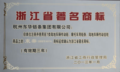 東華加強(qiáng)自主品牌建設(shè),創(chuàng)建的各類商標(biāo)也得到各級政府部門、主管部門的高度評價(jià)?!皷|華”商標(biāo)被國家工商行政管理總局商評委認(rèn)定為“馳名商標(biāo)”、東華“DONGHUA”牌工業(yè)鏈條為杭州市名牌產(chǎn)品、中國機(jī)電產(chǎn)品進(jìn)出口商會“推薦出口品牌”、“自強(qiáng)(Zq)”牌工業(yè)鏈條為浙江名牌產(chǎn)品、東華注冊并使用在7類鏈條商品上的“自強(qiáng)”(注冊證號:1542721商標(biāo)為浙江省著名商標(biāo)、東華“DH”為“浙江出口名牌”和“中國機(jī)械工業(yè)優(yōu)質(zhì)品牌”、“東華”企業(yè)商號為“浙江省知名商號”、東華集團(tuán)為“出口免驗(yàn)企業(yè)”、“中國質(zhì)量誠信企業(yè)”等榮譽(yù)稱號。