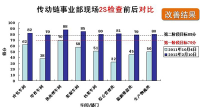 2S管理明顯提高并標準化作業(yè) 通過2S的運行,傳動鏈事業(yè)部員工的現(xiàn)場2S意識和管理都得到了明顯提升,如包裝車間現(xiàn)場管理的雜亂改善到目前的現(xiàn)場流程規(guī)范、通道流暢、物品擺放整齊等,熱處理車間設(shè)備運行狀態(tài)可視化等;同時廣大員工學會了總結(jié)與標準化操作,如現(xiàn)場檢查標準化、任務改善驗證標準化、管理點檢標準化、現(xiàn)場作業(yè)標準化等。