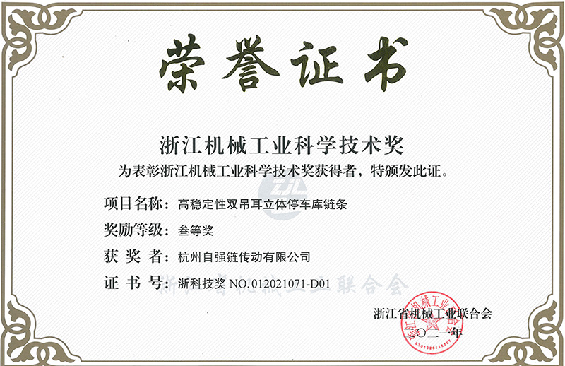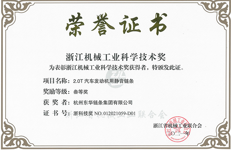 6月30日,浙江省機械工業(yè)聯合會召開會員大會。會上表彰2021年度浙江機械工業(yè)科學技術獎,全省機械領域共有72項科技創(chuàng)新項目獲獎。東華 “2.0T汽車發(fā)動機用靜音鏈條”和“高穩(wěn)定性雙吊耳立體停車庫鏈條”均獲三等獎,這是東華產品創(chuàng)新項目連續(xù)十年榮獲浙江機械工業(yè)科技獎,也是2021年度全省機械行業(yè)科技創(chuàng)新成果獎中唯一鏈傳動企業(yè)的高端產品獲獎。